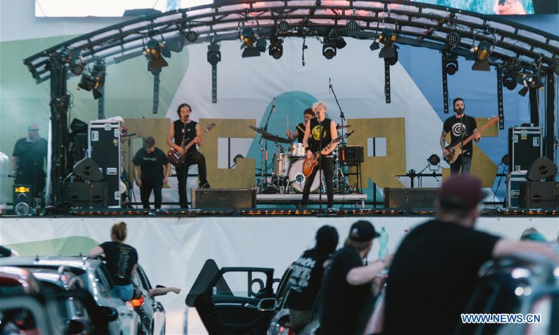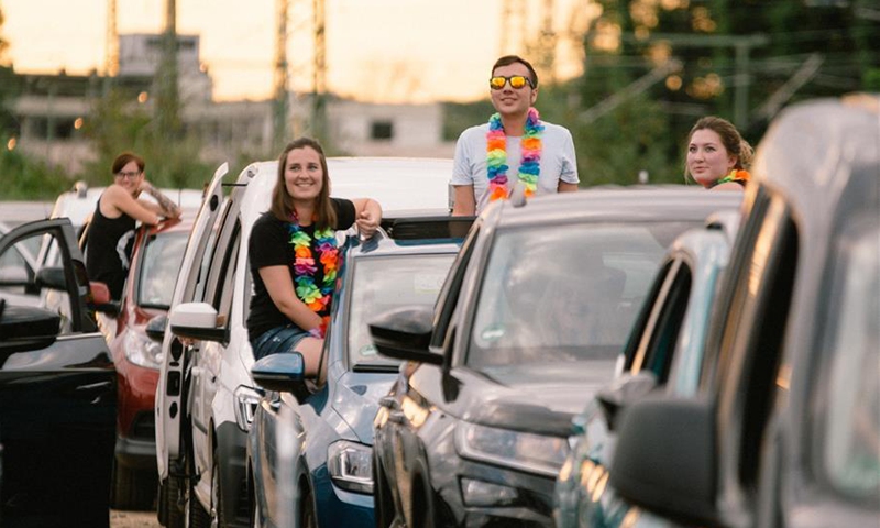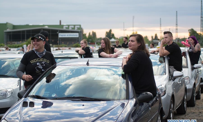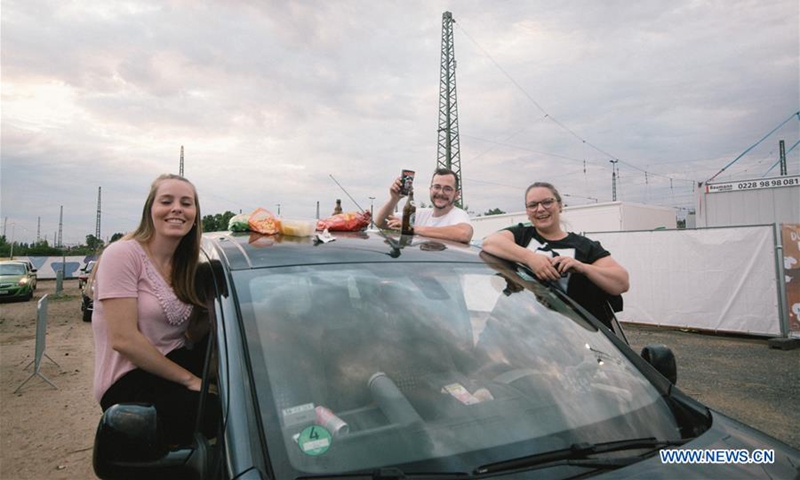 People watch a drive-in concert from their vehicles in Bonn, Germany, on June 13, 2020. The drive-in concert was held here on Saturday with strict measures for people to enjoy the music while maintaining social distancing. (Photo by Tang Ying/Xinhua)