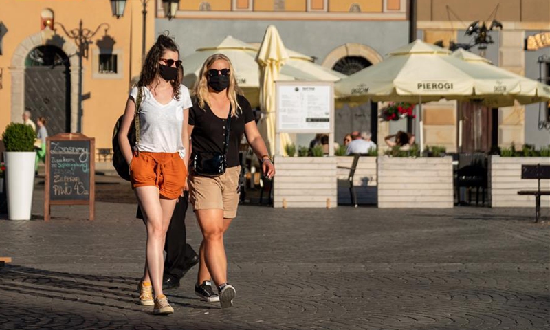 People wearing face masks walk in the Old Town of Warsaw, Poland, June 14, 2020. Poland reopened its borders with European Union (EU) countries at midnight on Friday, ending a travel lockdown that was in place since March 15 due to the COVID-19 pandemic. (Xinhua/Zhou Nan)