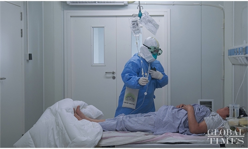 Volunteers from the Beijing Blue Sky Rescue Team spray disinfectant in Yuegezhuang wholesale market in Fengtai district, Beijing. The market is about 12 kilometers from the Xinfadi market, which is linked to the recent COVID-19 outbreak in the capital city. Photo: people.cn