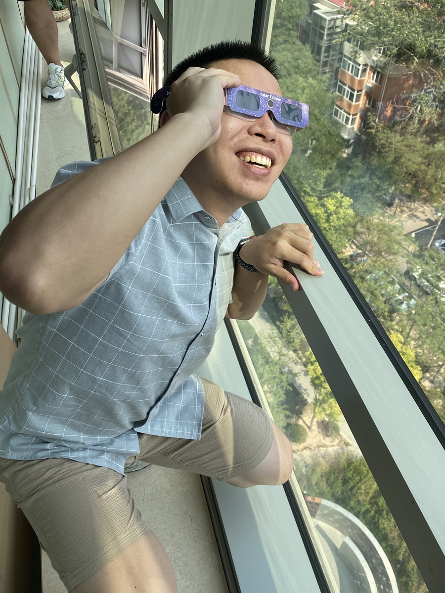 A Beijing resident observes the solar eclipse on Sunday afternoon. Photo: Deng Xiaoci/GT