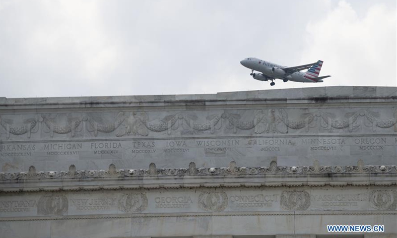 An airplane is seen above the Lincoln Memorial in Washington, D.C., the United States, on June 22, 2020. U.S. COVID-19 deaths surpassed 120,000 on Monday with nearly 2.3 million infections, while new cases continue to increase across the country over three months into the pandemic. (Xinhua/Liu Jie)