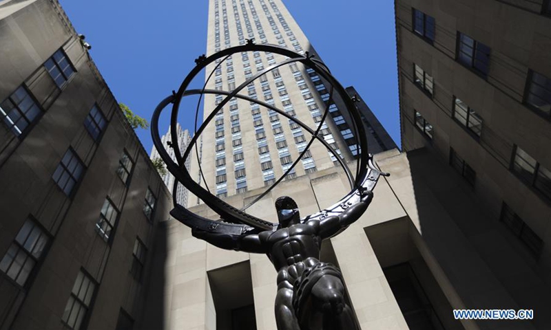 The Atlas statue is seen adorned with a face mask at Rockefeller Center in New York, the United States, on June 22, 2020. U.S. COVID-19 deaths surpassed 120,000 on Monday with nearly 2.3 million infections, while new cases continue to increase across the country over three months into the pandemic. (Xinhua/Wang Ying)