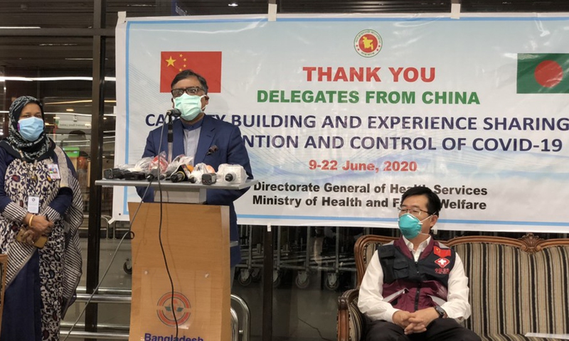 Bangladeshi Health and Family Welfare Minister Zahid Maleque (C) speaks at a farewell ceremony held in capital Dhaka, Bangladesh, June 22, 2020. (Xinhua/Liu Chuntao)