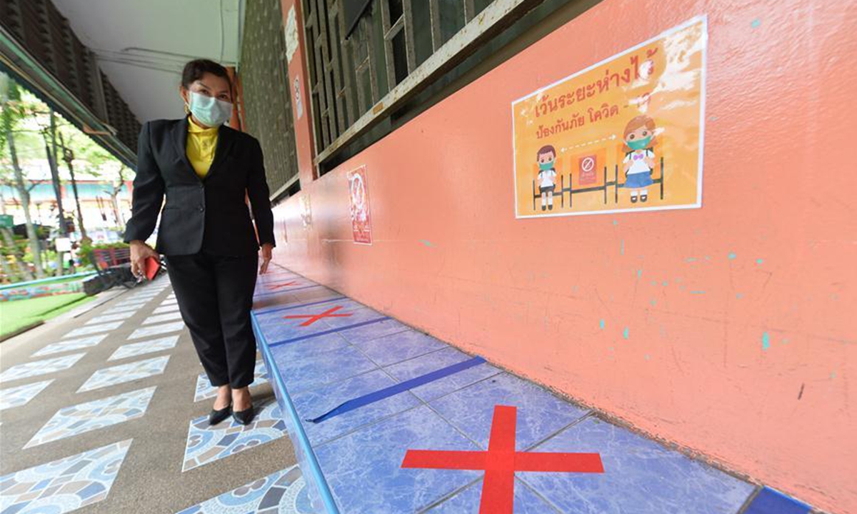 A teacher checks marks reminding students to keep social distancing at a school in Bangkok, Thailand, June 23, 2020. Schools in Thailand are scheduled to reopen on July 1. (Xinhua/Rachen Sageamsak)