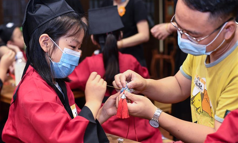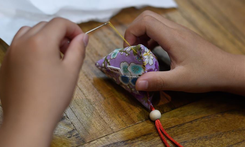 A girl makes a sachet as a traditional custom on the Dragon Boat Festival at a pharmacy in Hangzhou, east China's Zhejiang Province, June 25, 2020. The Dragon Boat Festival, also called the Duanwu Festival, is traditionally celebrated on the fifth day of the fifth month on Chinese lunar calendar. It falls on June 25 this year. (Xinhua/Huang Zongzhi)