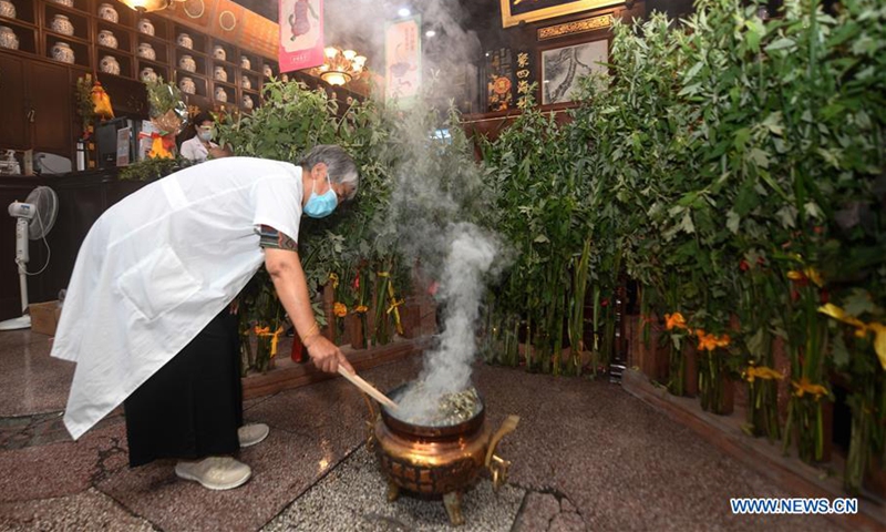 A pharmaceutical worker burns wormwood as a traditional custom on the Dragon Boat Festival in Hangzhou, east China's Zhejiang Province, June 25, 2020. The Dragon Boat Festival, also called the Duanwu Festival, is traditionally celebrated on the fifth day of the fifth month on Chinese lunar calendar. It falls on June 25 this year. (Xinhua/Huang Zongzhi)