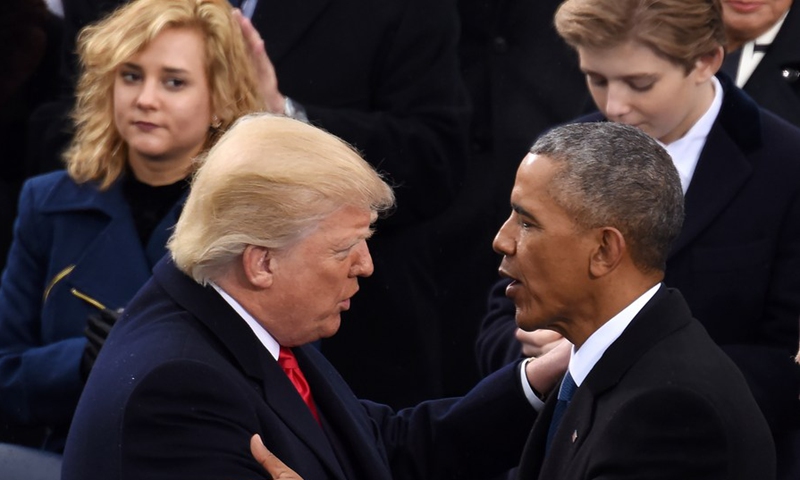 Photo taken on Jan. 20, 2017 shows U.S. President Donald Trump (L, front) being greeted by former U.S. President Barack Obama after delivering his inaugural address during the presidential inauguration ceremony at the Capitol in Washington, D.C., the United States. (Xinhua/Yin Bogu)