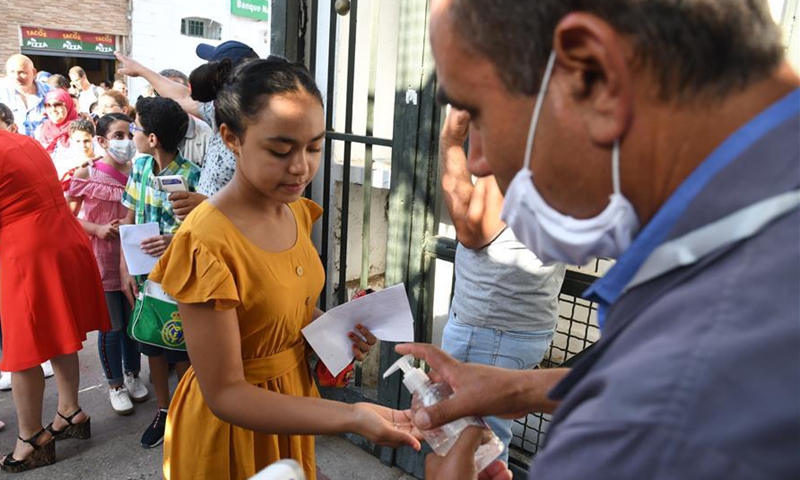A student reaches for sanitizer before the secondary school entrance examination amid COVID-19 pandemic in Tunisia, Tunis, June 29, 2020. (Photo by Adel Ezzine/Xinhua)