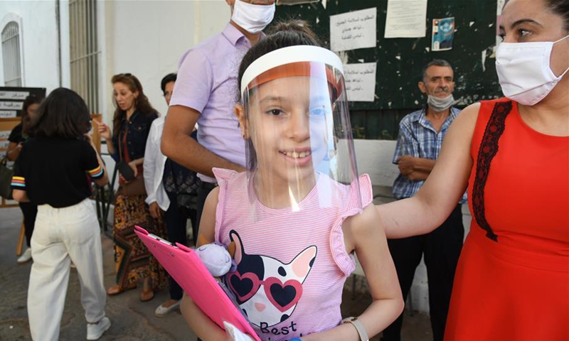 A student wearing a face shield attends the secondary school entrance examination amid COVID-19 pandemic in Tunisia, Tunis, June 29, 2020. (Photo by Adel Ezzine/Xinhua)