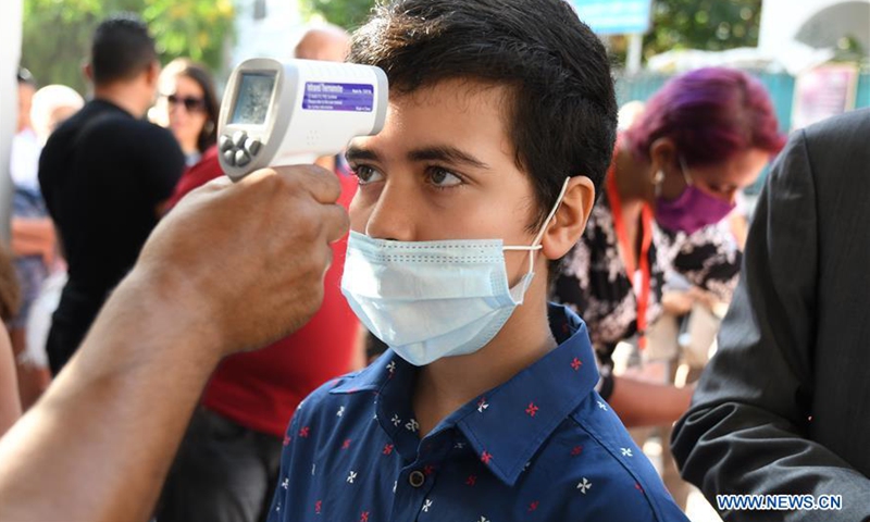 A student gets his body temperature checked before the secondary school entrance examination amid COVID-19 pandemic in Tunisia, Tunis, June 29, 2020. (Photo by Adel Ezzine/Xinhua)