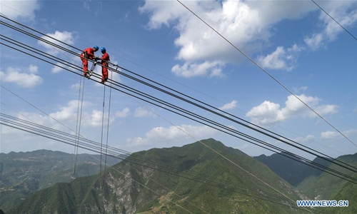 In this aerial photo taken on May 8, 2020, workers install overhead power lines for an 800KV direct current electricity transmission project linking northwest China's Qinghai Province and central China's Henan Province, in Zhen'an County of northwest China's Shaanxi Province. (Xinhua/Tao Ming)
