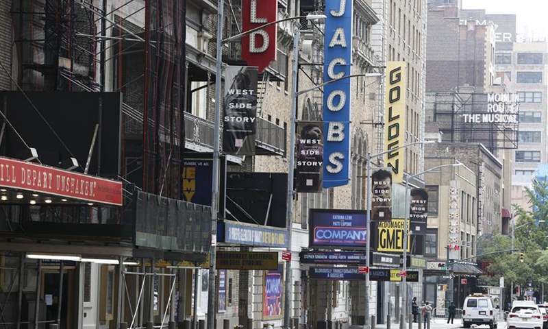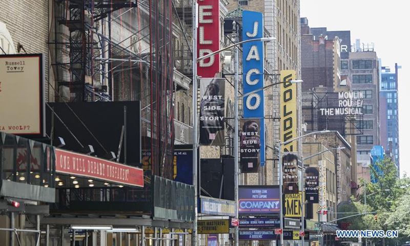 Photo taken on June 29, 2020 shows the Broadway theaters in New York, the United States. The Broadway League announced on Monday that Broadway performances in New York City will be suspended through the remainder of 2020 due to COVID-19. Broadway theatres are now offering refunds and exchanges for tickets purchased for all performances through January 3, 2021. Broadway performances were suspended on March 12, 2020. (Xinhua/Wang Ying)