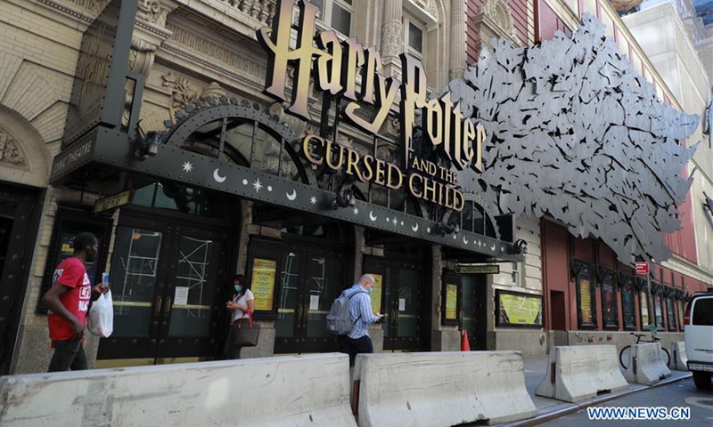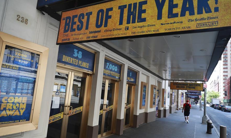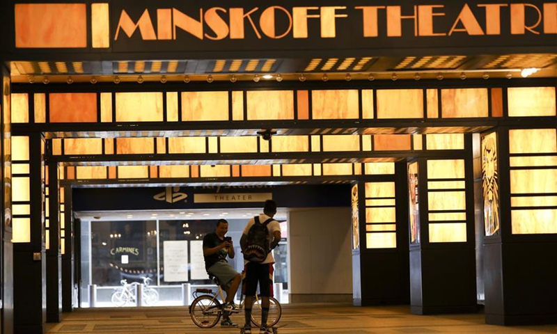 Pedestrians walk past a closed Broadway theater in New York, the United States, June 29, 2020. The Broadway League announced on Monday that Broadway performances in New York City will be suspended through the remainder of 2020 due to COVID-19. Broadway theatres are now offering refunds and exchanges for tickets purchased for all performances through January 3, 2021. Broadway performances were suspended on March 12, 2020. (Xinhua/Wang Ying)