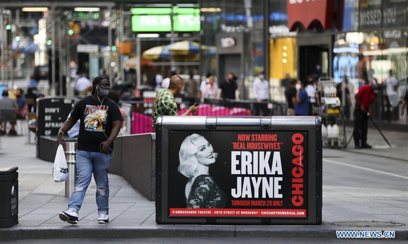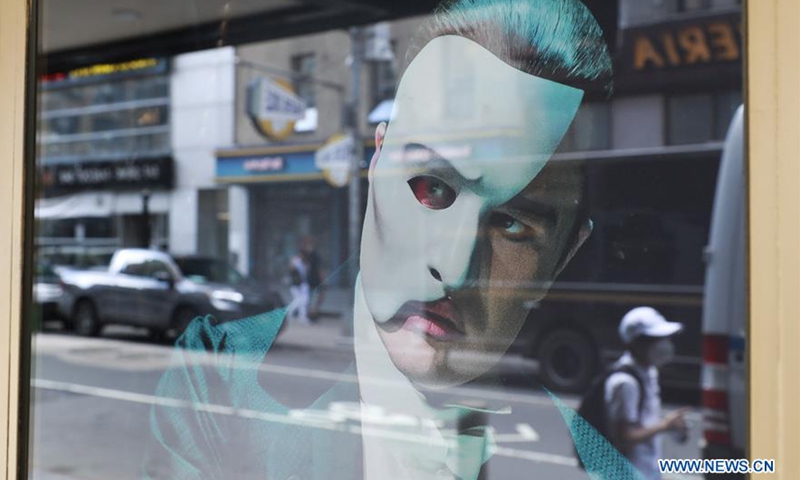 A pedestian walks past an advertisement of a Broadway performance on Times Square in New York, the United States, June 29, 2020. The Broadway League announced on Monday that Broadway performances in New York City will be suspended through the remainder of 2020 due to COVID-19. Broadway theatres are now offering refunds and exchanges for tickets purchased for all performances through January 3, 2021. Broadway performances were suspended on March 12, 2020. (Xinhua/Wang Ying)