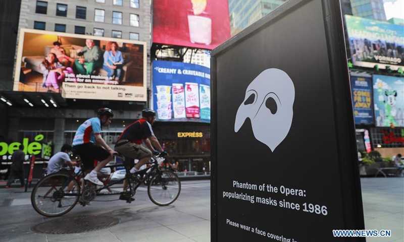 Bike riders pass by an advertisement of a Broadway performance on Times Square in New York, the United States, June 29, 2020. The Broadway League announced on Monday that Broadway performances in New York City will be suspended through the remainder of 2020 due to COVID-19. Broadway theatres are now offering refunds and exchanges for tickets purchased for all performances through January 3, 2021. Broadway performances were suspended on March 12, 2020. (Xinhua/Wang Ying)