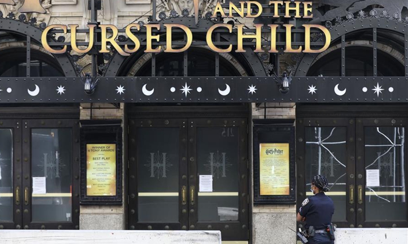 A police officer looks at a closed Broadway theater in New York, the United States, June 29, 2020. The Broadway League announced on Monday that Broadway performances in New York City will be suspended through the remainder of 2020 due to COVID-19. Broadway theatres are now offering refunds and exchanges for tickets purchased for all performances through January 3, 2021. Broadway performances were suspended on March 12, 2020. (Xinhua/Wang Ying)