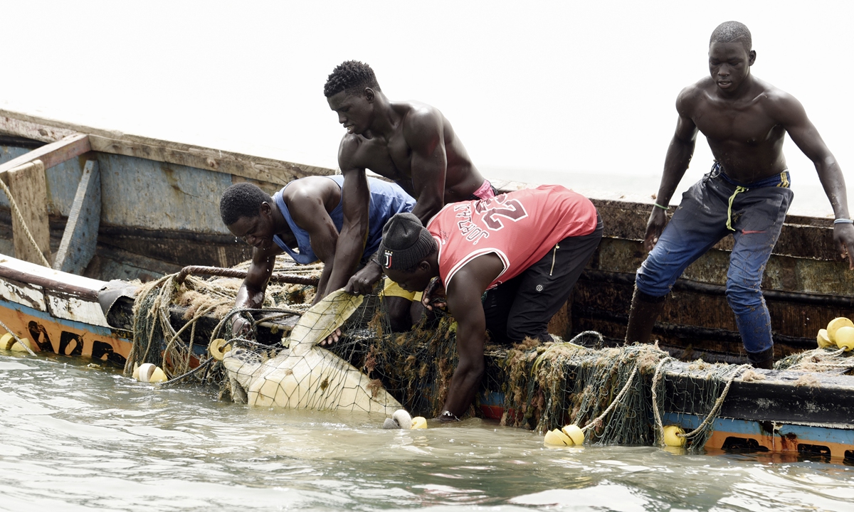 Senegalese fishermen save a sea turtle from their fishing nets in Joal, Senegal, on June 16. Photo: AFP