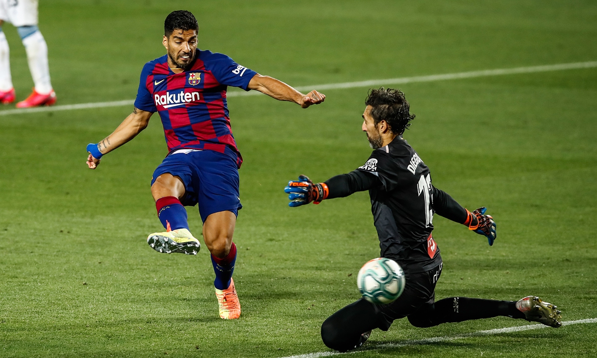 Barcelona striker Luis Suarez (left) scores against Espanyol on Wednesday at Camp Nou in Barcelona, Spain. Photo: VCG