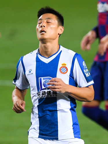 Espanyol striker Wu Lei reacts in the match against Barcelona on Wednesday at Camp Nou in Barcelona, Spain. Photo: VCG
