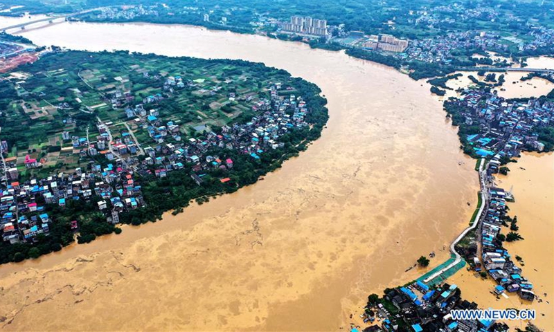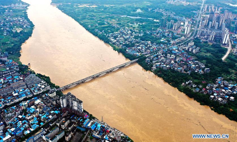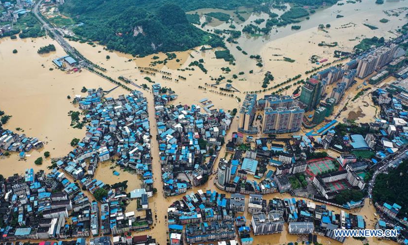 Aerial photo taken on July 11, 2020 shows a river across the urban area being in spate after heavy rain in Rongshui Miao Autonomous County, south China's Guangxi Zhuang Autonomous Region. The county was hit by heavy rainfall from July 10 to 11. (Xinhua/Zhang Ailin)