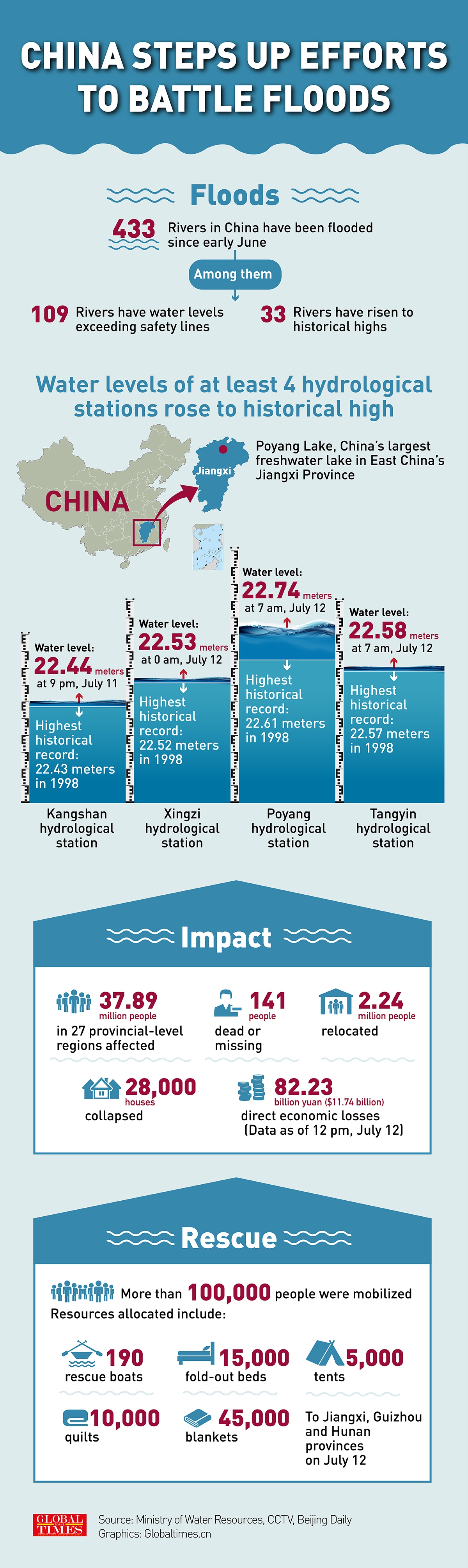 But the situation in East China's Jiangxi is among the most severe. Hydrological stations at Poyang Lake, the main water body in Jiangxi and the largest freshwater lake in China, have all exceeded warning levels, and at least four of the hydrological stations have exceeded the record flood levels of 1998.