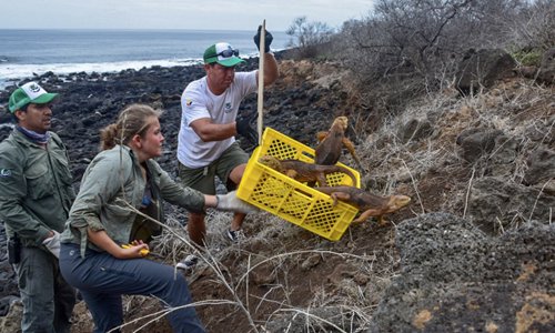 This handout photo, released by the Galapagos National Park, shows a group of a part of 1,436 iguanas of the subspecies Conolophus Subcristatus, from Seymour Norte Island, being introduced to Santiago Island as part of a conservation program in the Galapagos Islands on Monday. Photo: AFP