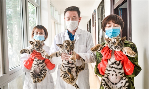 Staff at Wangcheng Park in Luoyang, Central China’s Henan Province, show off three newborn South China tiger cubs. ...