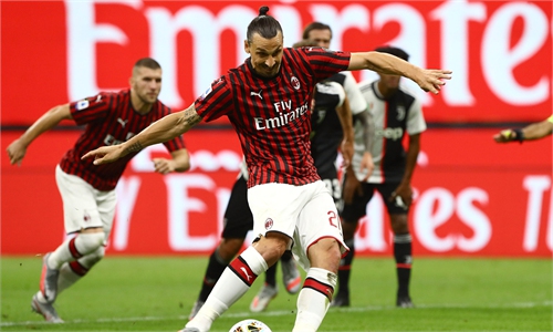 AC Milan striker Zlatan Ibrahimovic reaches for the ball in the match against Sassuolo on Tuesday in Reggio Emilia, Italy. Photo: IC