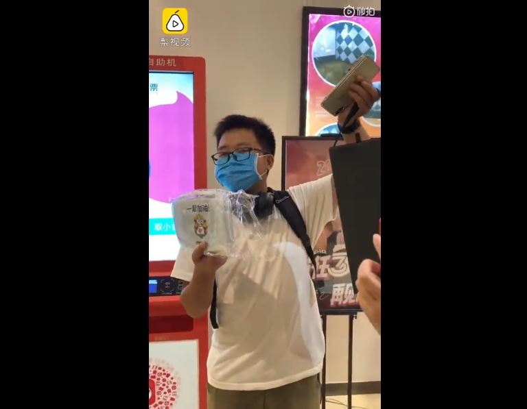 A man who bought the very first post-epidemic movie ticket receives a "lucky pack" as a reward by a theater in Chengdu, Southwest China's Sichuan Province, on Monday. Photo: Screenshot from a video posted Pear Video.