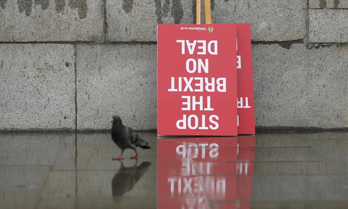 A pigeon is seen near placards demanding extension of Brexit transition period outside the Houses of Parliament in London, Britain, on June 10, 2020. Britain will not extend its transitional links to the European Union (EU) beyond Dec. 31, a government minister said Tuesday following the stalled talks between London and Brussels last week. (Photo by Tim Ireland/Xinhua)