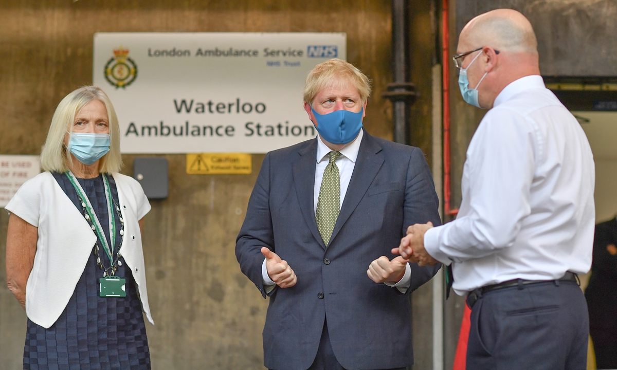 British Prime Minister Boris Johnson (center), wearing a face mask or covering due to the COVID-19 pandemic, talks with the CEO of the London Ambulance Service Garrett Emmerson (right) and Chair of the London Ambulance Service Heather Lawrence during his visit to the headquarters of the London Ambulance Service NHS Trust in central London on Monday. Britain announced 11 more coronavirus deaths, taking the total number of victims to 44,830. Photo: AFP