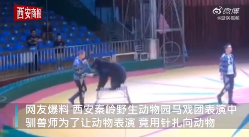 A wildlife zoo in Xi'an, Northwest China's Shaanxi Province, issued an announcement on Wednesday in response to a widely circulated video in which a black bear at the zoo appeared to be poked with a needle by an animal trainer to force it do a hula hoop dance during a performance.