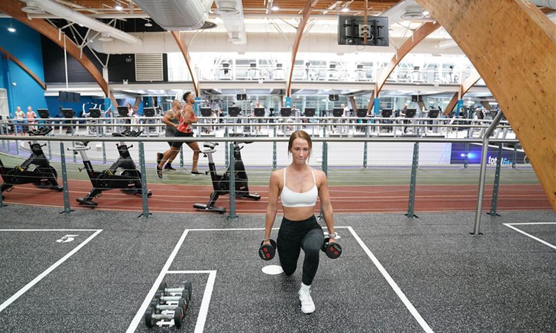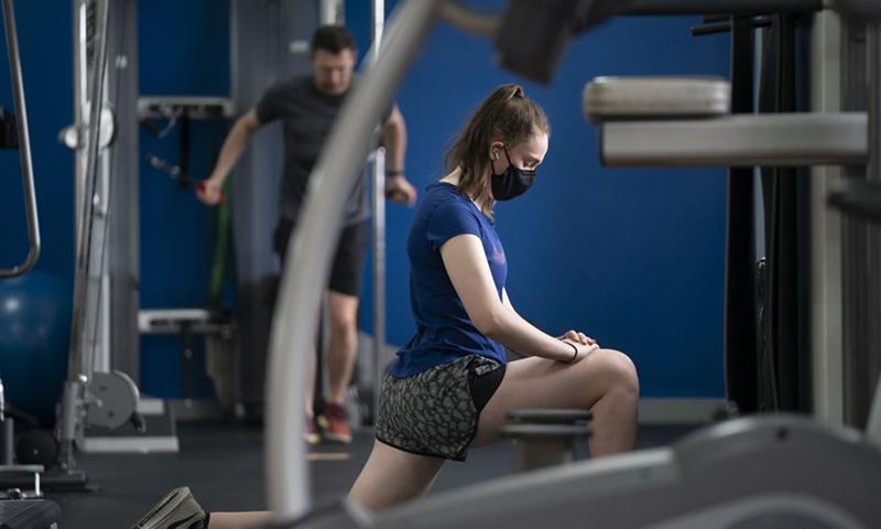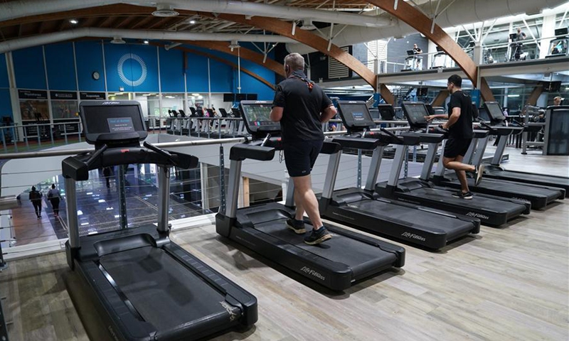 People work out at a gym in Manchester, Britain, on July 25, 2020. According to the British government's guidance, indoor gyms, swimming pools and sports facilities could reopen from July 25. (Photo by Jon Super/Xinhua)