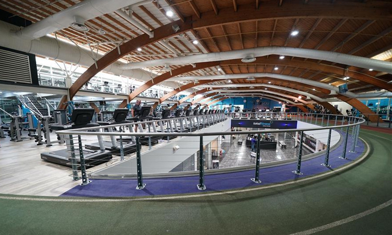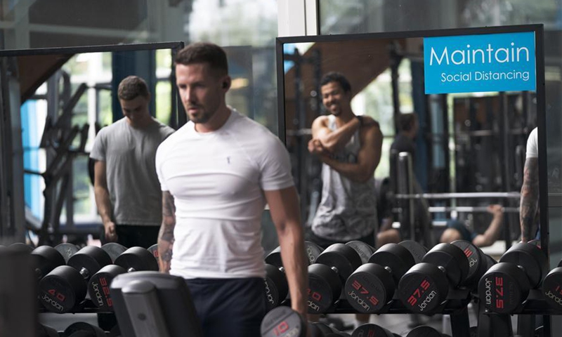 People work out as they practice social distancing at a gym in Manchester, Britain, on July 25, 2020. According to the British government's guidance, indoor gyms, swimming pools and sports facilities could reopen from July 25. (Photo by Jon Super/Xinhua)