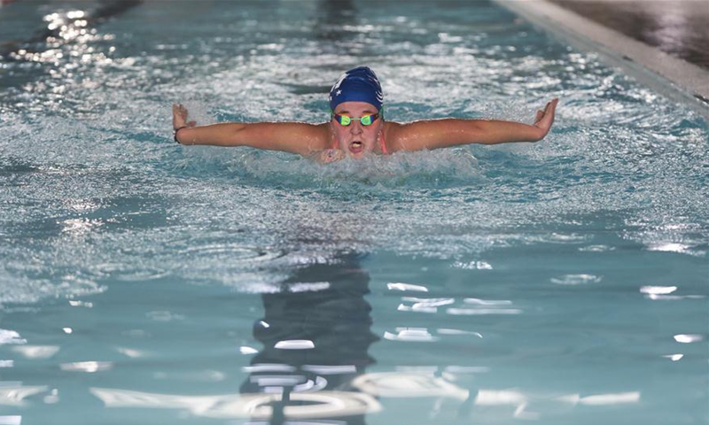 A woman swims at a gym in Manchester, Britain, on July 25, 2020. According to the British government's guidance, indoor gyms, swimming pools and sports facilities could reopen from July 25. (Photo by Jon Super/Xinhua)