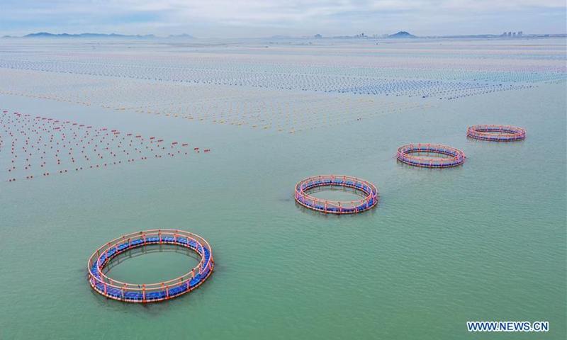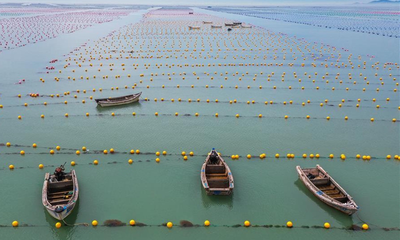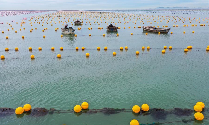 Aerial photo shows aquaculture floats at a sea farm in Rongcheng, east China's Shandong Province, July 26, 2020. Eco-friendly floats are widely used in the local aquaculture industry. (Photo by Li Xinjun/Xinhua)
