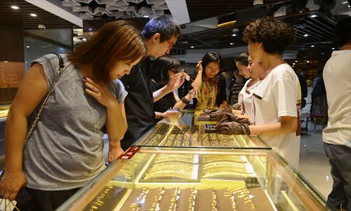 File pohoto: Customers buy gold jewelry in a department store in Beijing. Photo: CFP