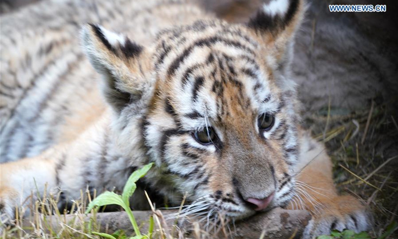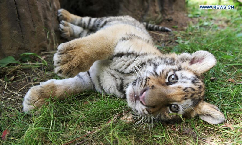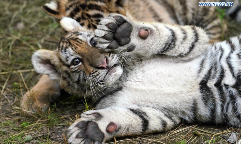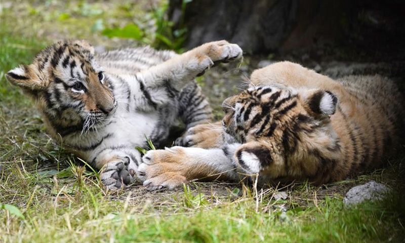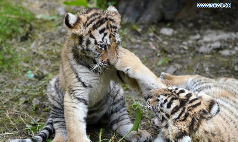 Two newborn Siberian tiger cubs frolic at Hengdaohezi Siberian Tiger Park in Hailin, northeast China's Heilongjiang Province, July 28, 2020. The park's two-month-old newborn Siberian tiger cubs are offered special activity spaces to frolic in the outdoors. (Xinhua/Wang Jianwei)