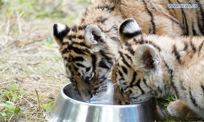 Two newborn Siberian tiger cubs drink water at Hengdaohezi Siberian Tiger Park in Hailin, northeast China's Heilongjiang Province, July 28, 2020. The park's two-month-old newborn Siberian tiger cubs are offered special activity spaces to frolic in the outdoors. (Xinhua/Wang Jianwei)