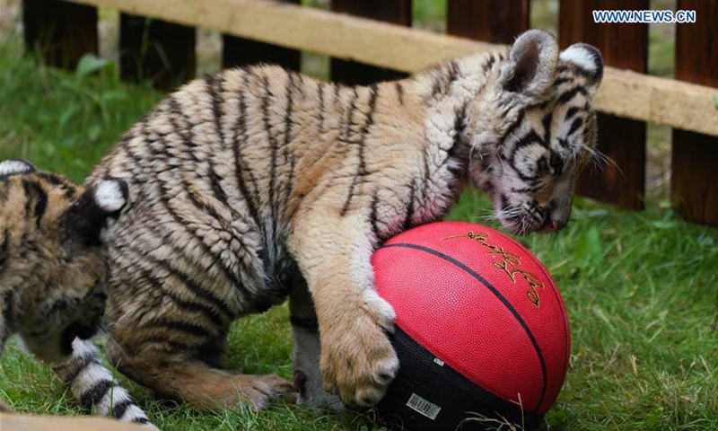Two newborn Siberian tiger cubs play with a ball at Hengdaohezi Siberian Tiger Park in Hailin, northeast China's Heilongjiang Province, July 28, 2020. The park's two-month-old newborn Siberian tiger cubs are offered special activity spaces to frolic in the outdoors. (Xinhua/Wang Jianwei)