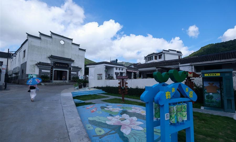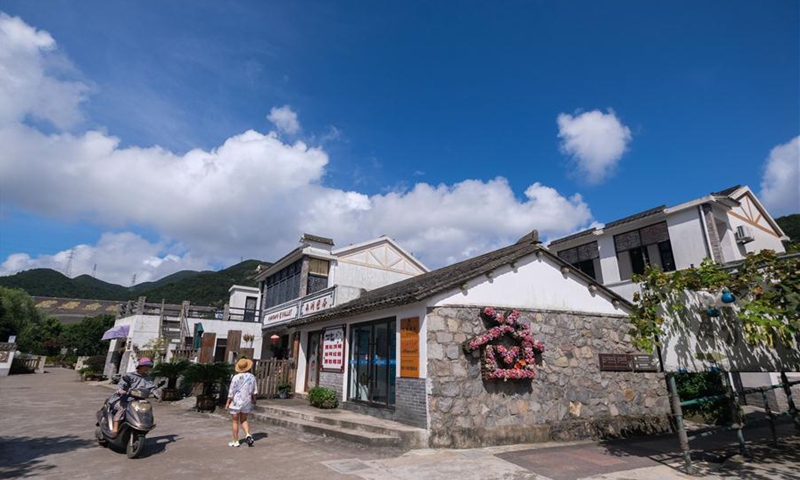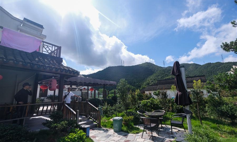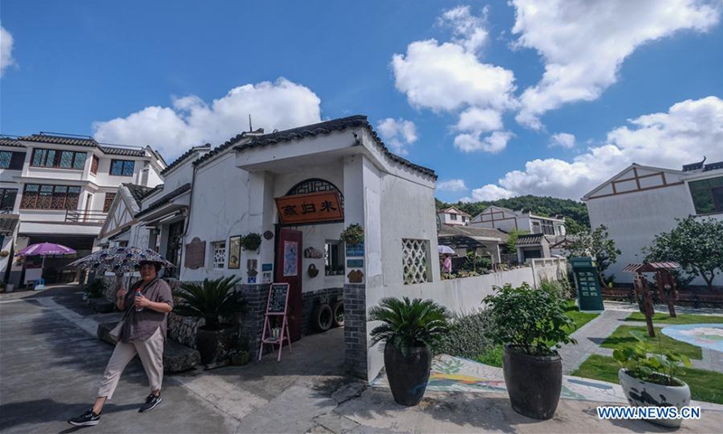 A tourist walks out of an agritainment facility in Xinjian Village of Ganlan Township, Dinghai District, Zhoushan, east China's Zhejiang Province, Aug. 3, 2020. In recent years, the Dinghai District authorities have devoted all-round efforts to improve sanitation and tourist appeal in its rural areas. Statistics show that villages under Dinghai District have received 1.73 million visitor trips in 2019, earning 2.431 billion yuan (348 million U.S. dollars) in tourism revenue. (Xinhua/Xu Yu)