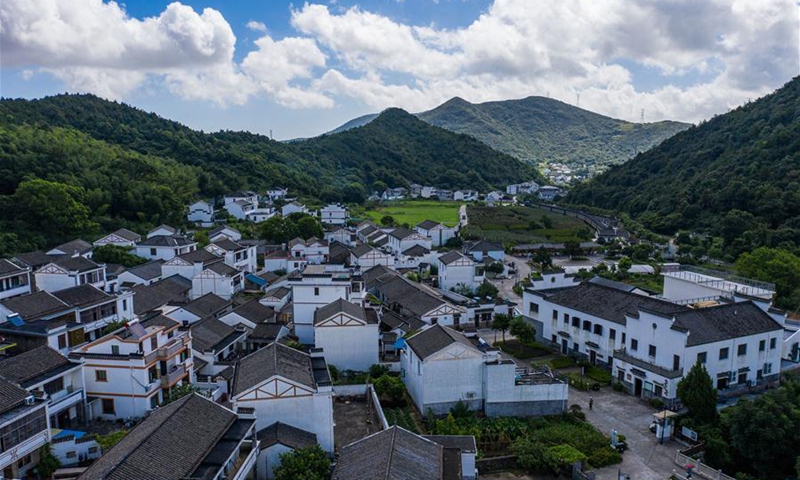 Aerial photo shows a view of Xinjian Village of Ganlan Township, Dinghai District, Zhoushan, east China's Zhejiang Province, Aug. 3, 2020. In recent years, the Dinghai District authorities have devoted all-round efforts to improve sanitation and tourist appeal in its rural areas. Statistics show that villages under Dinghai District have received 1.73 million visitor trips in 2019, earning 2.431 billion yuan (348 million U.S. dollars) in tourism revenue. (Xinhua/Xu Yu)