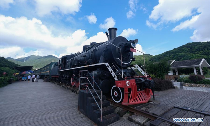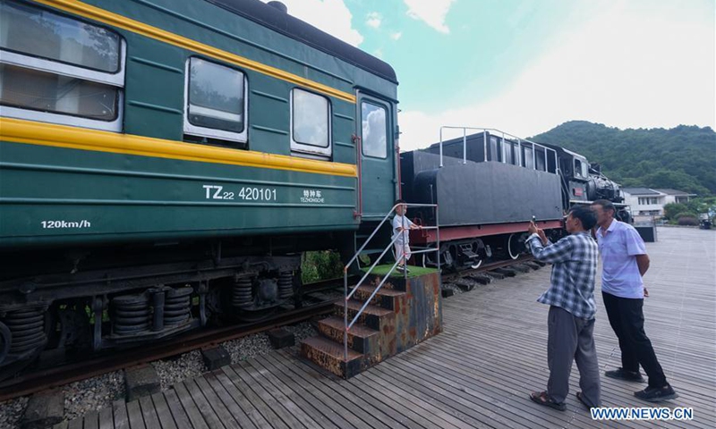 Tourists visit a railway-themed scenic area in Xinjian Village of Ganlan Township, Dinghai District, Zhoushan, east China's Zhejiang Province, Aug. 3, 2020. In recent years, the Dinghai District authorities have devoted all-round efforts to improve sanitation and tourist appeal in its rural areas. Statistics show that villages under Dinghai District have received 1.73 million visitor trips in 2019, earning 2.431 billion yuan (348 million U.S. dollars) in tourism revenue. (Xinhua/Xu Yu)