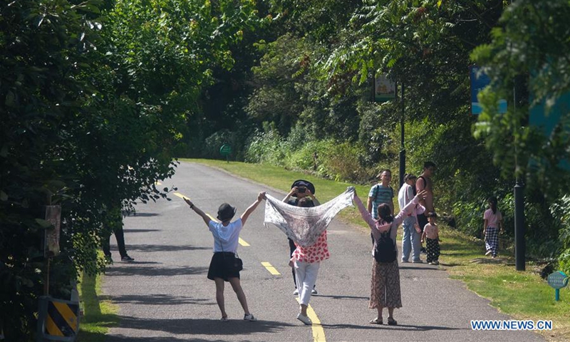 Tourists visit a scenic area in Xinjian Village of Ganlan Township, Dinghai District, Zhoushan, east China's Zhejiang Province, Aug. 3, 2020. In recent years, the Dinghai District authorities have devoted all-round efforts to improve sanitation and tourist appeal in its rural areas. Statistics show that villages under Dinghai District have received 1.73 million visitor trips in 2019, earning 2.431 billion yuan (348 million U.S. dollars) in tourism revenue. (Xinhua/Xu Yu)