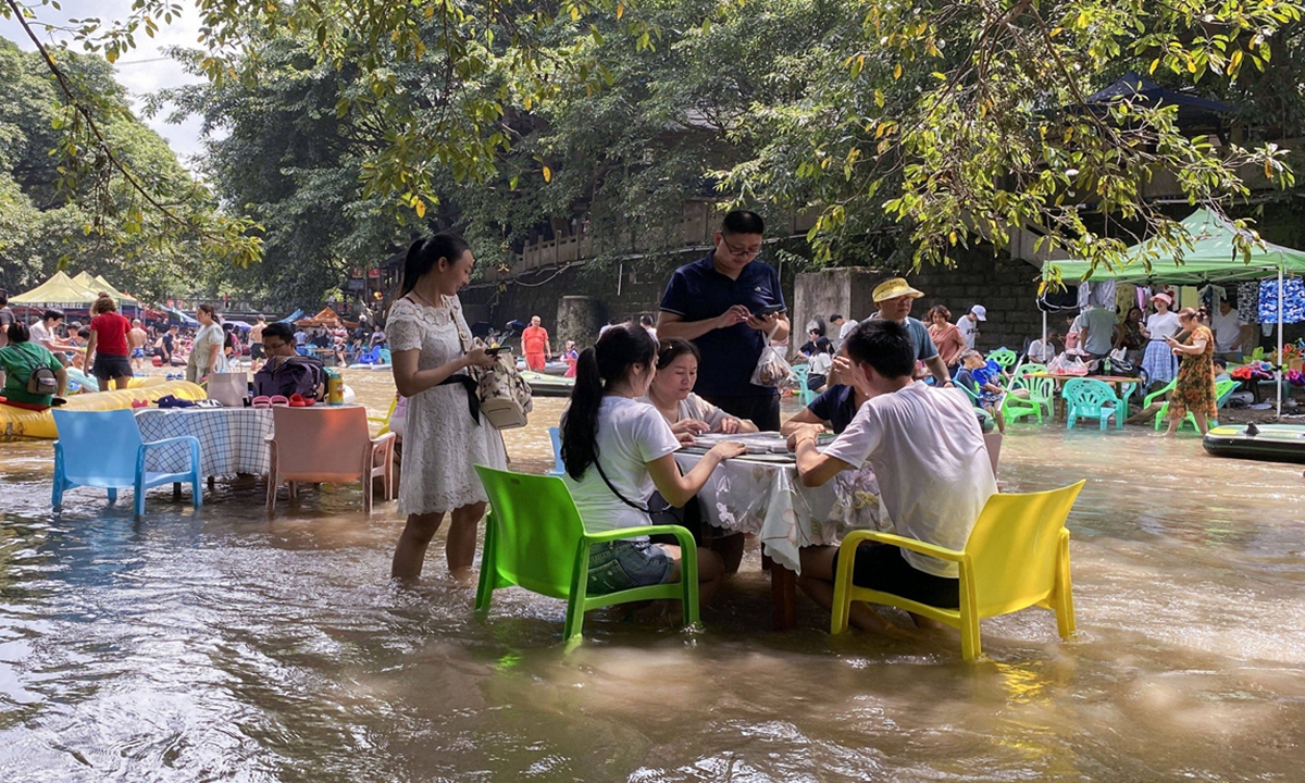 Residents in Pianyan township, Southwest China's Chongqing Municipality, play mahjong in a stream to beat the summer heat. Photo: IC