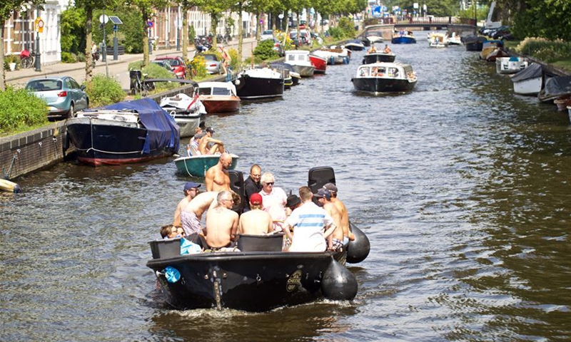 People sail along a river on a hot day in Haarlem, the Netherlands, Aug. 8, 2020. (Photo by Sylvia Lederer/Xinhua)