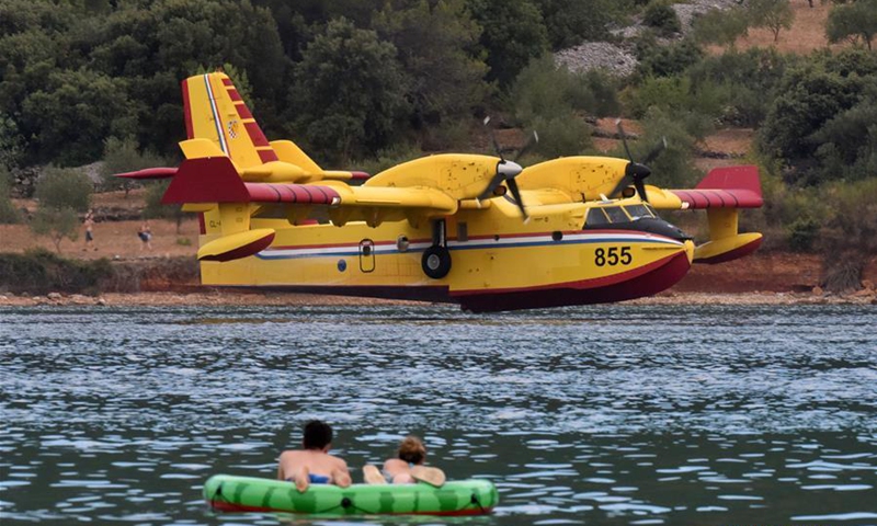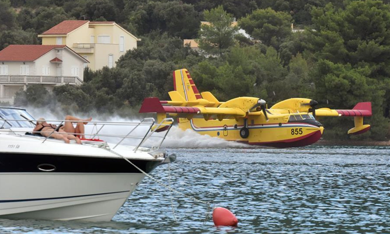 A Canadair fire-fighting plane swoops down on the Adriatic Sea to pick up water at Grebastica beach near Sibenik, Croatia, Aug. 9, 2020. (Hrvoje Jelavic/Pixsell via Xinhua)