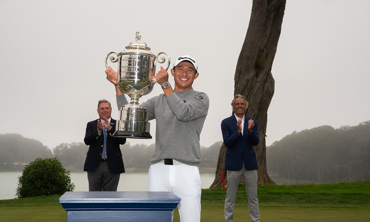 Collin Morikawa receives the Wanamaker Trophy after winning the 2020 PGA Championship on Sunday in San Francisco, California. Photo: VCG