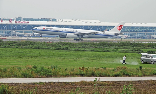 An Air China flight lands at Shanghai Pudong International Airport. Photo: cnsphoto