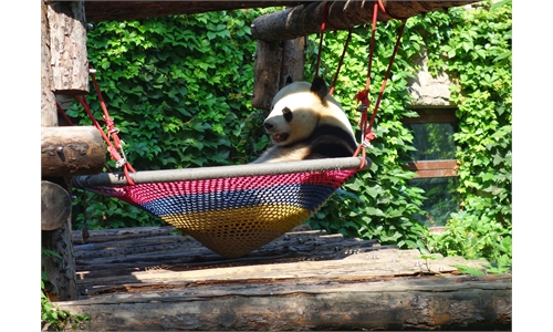 A giant panda cools itself in a cradle under a tree at a zoo in Beijing on a ...